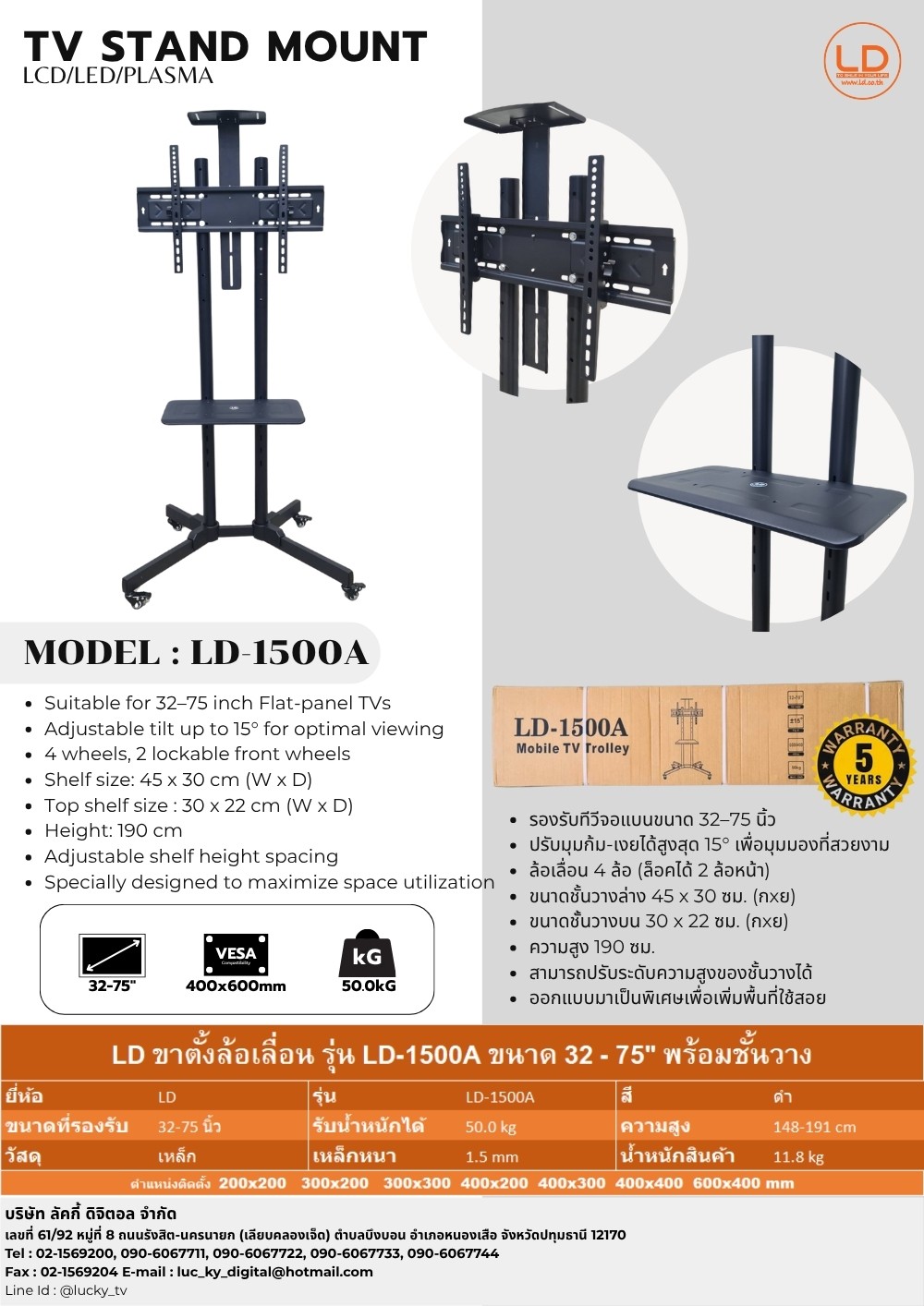 LD ขาตั้งล้อเลื่อน รุ่น LD-1500A ขนาด 32 - 75" พร้อมชั้นวาง