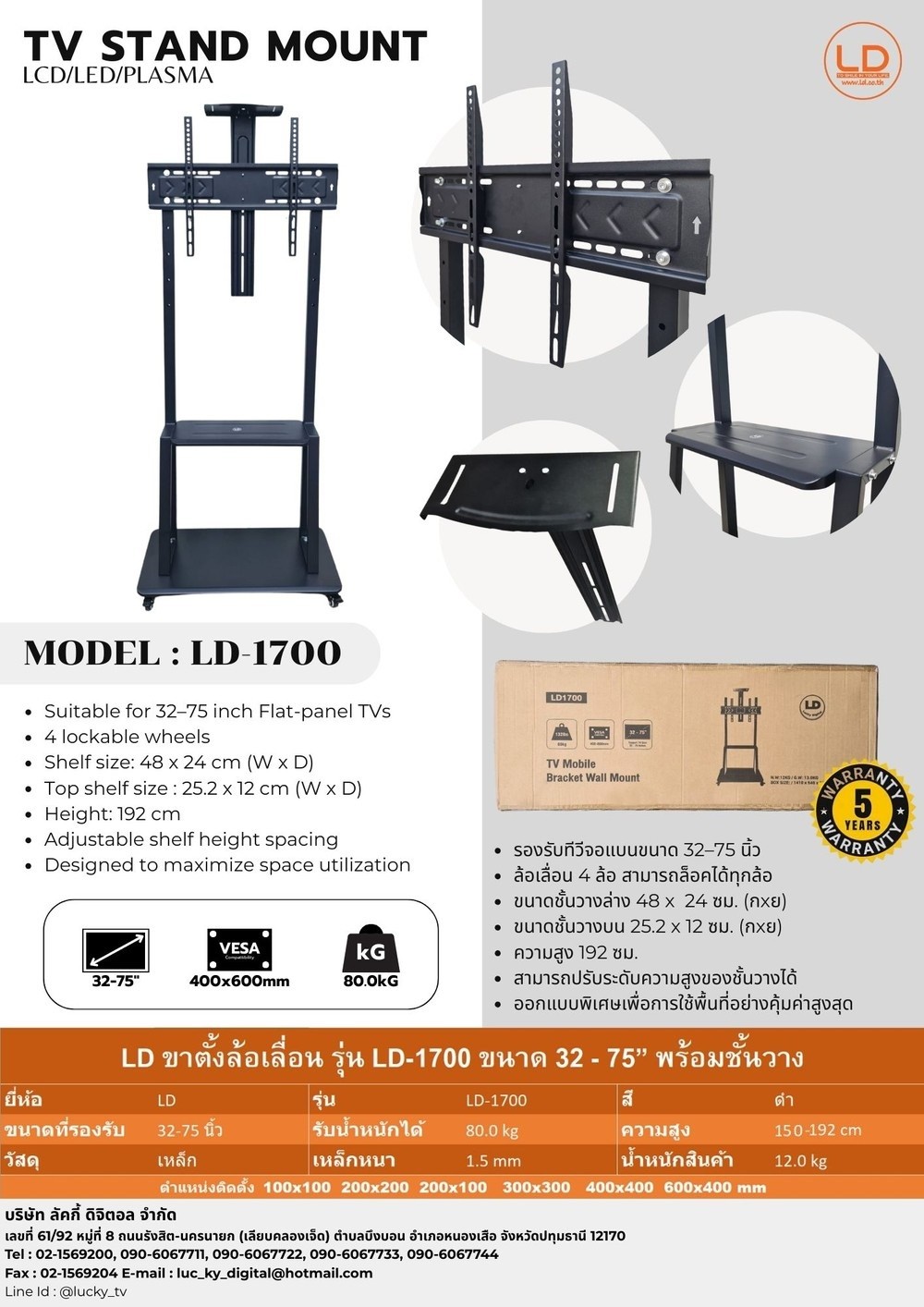 LD ขาตั้งล้อเลื่อน รุ่น LD-1700 ขนาด 32 - 75” พร้อมชั้นวาง